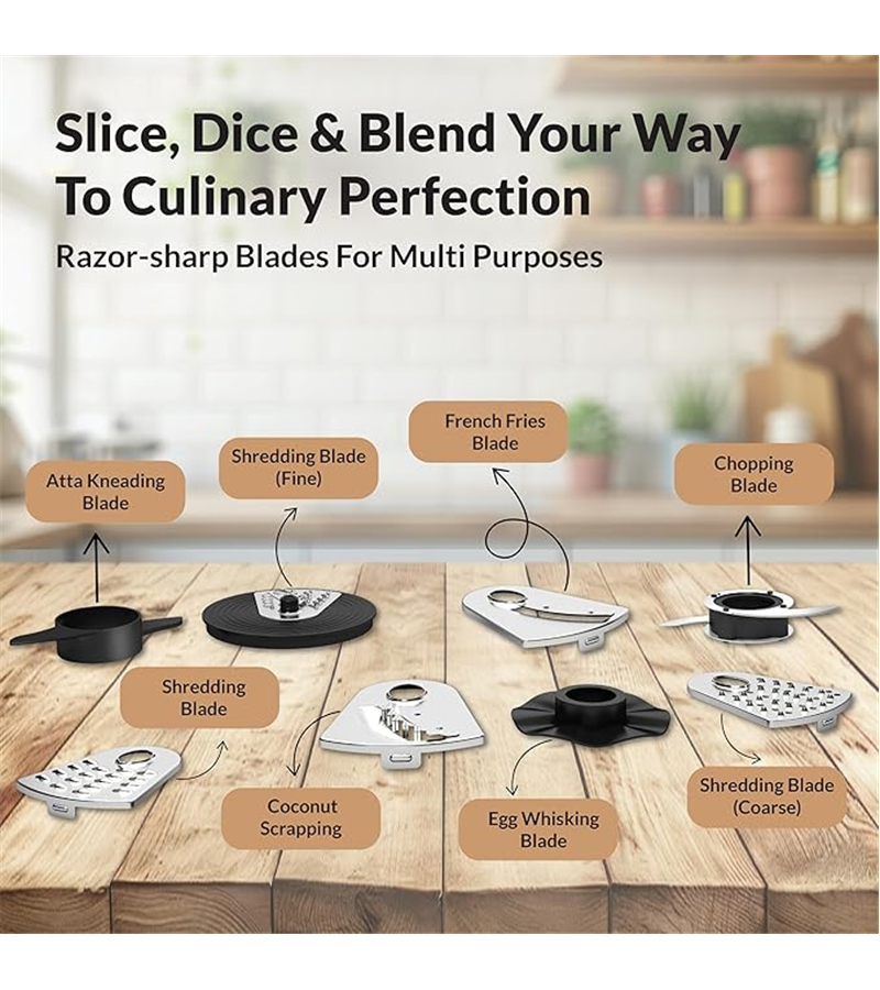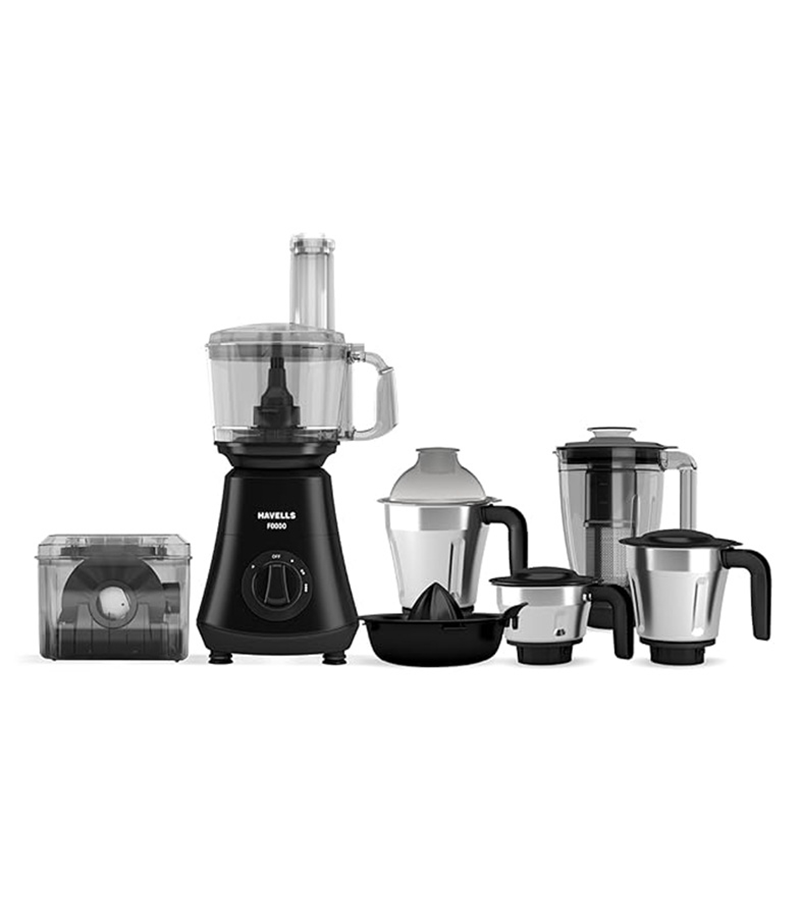 HAVELLS Powerful 750-Watt Motor Experience robust performance with the Havells Foodo Food Processor, equipped with a heavy-duty 750-watt motor. This powerful motor ensures efficient processing of ingredients, making it ideal for a variety of cooking tasks. Multiple Jars for Versatile Cooking Enjoy versatility in your culinary adventures with the five variable jars included with the Havells Foodo Food Processor. These jars cater to a wide range of cooking needs, including grinding, wet grinding, dry grinding, juicing, grating, kneading, roti making, chopping, mincing, blending, whipping, scraping, and slicing. Three-Speed Control for Precision Customize your food processing experience with the three-speed control feature of the Havells Food Processor. Adjust the speed according to your recipe requirements, ensuring precise results every time. Air Channelization System for Efficient Performance Experience efficient and consistent processing with the air channelization system of the Havells Foodo Food Processor. This system ensures proper airflow, preventing overheating and maintaining optimal performance throughout the food processing tasks. Variable Cooking Functions From grinding and chopping to juicing and slicing, the Havells Food Processor offers versatile cooking functions to meet all your culinary needs. Whether you''''''''re preparing sauces, soups, smoothies, or dough, this food processor has you covered with its wide range of capabilities.