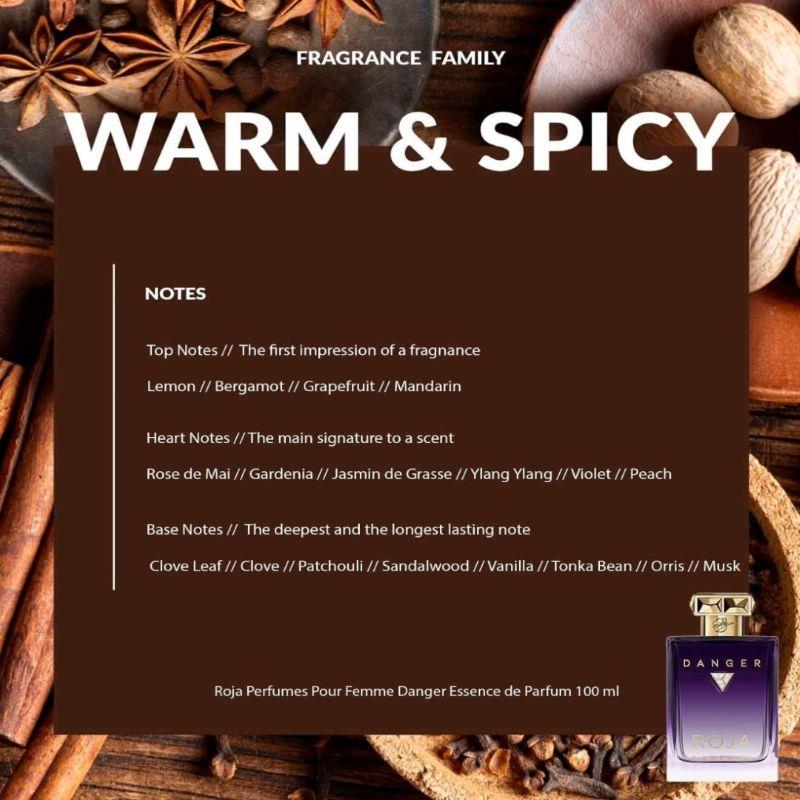 Danger essence de parfum from Roja Parfums is enticing for those who wear it and those who smell it. Built with a warming heart of vanilla, jasmine, ylang ylang and rose, the fragrance is topped with four zesty citrus fruits (lemon, bergamot, grapefruit and mandarin, we’re looking at you) and stacked atop a deep base of clove, patchouli, sandalwood and musk.